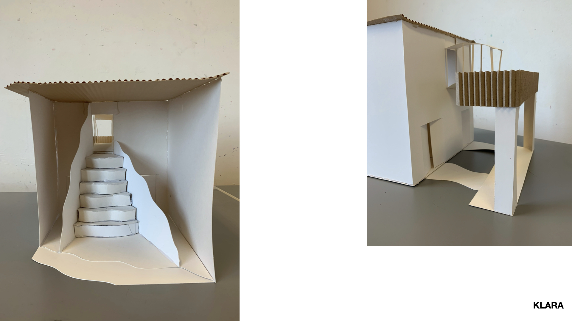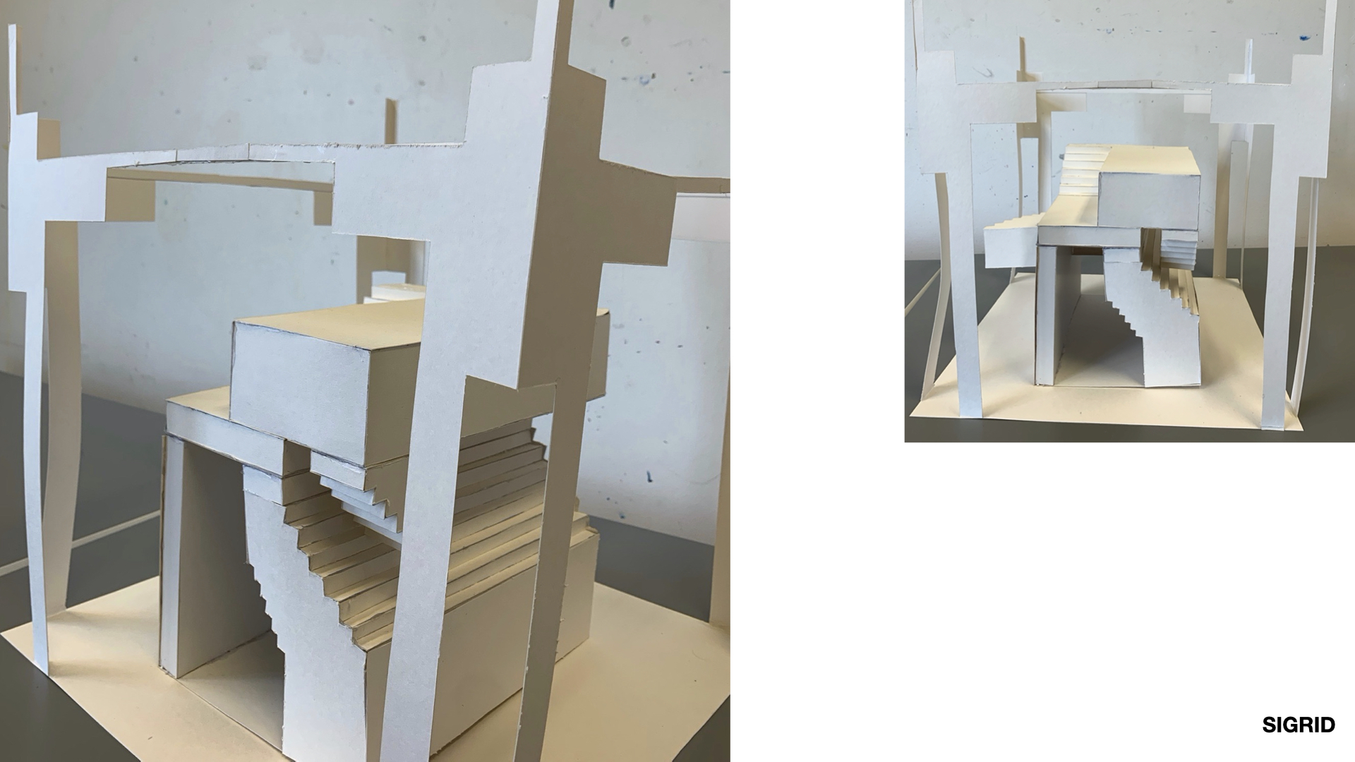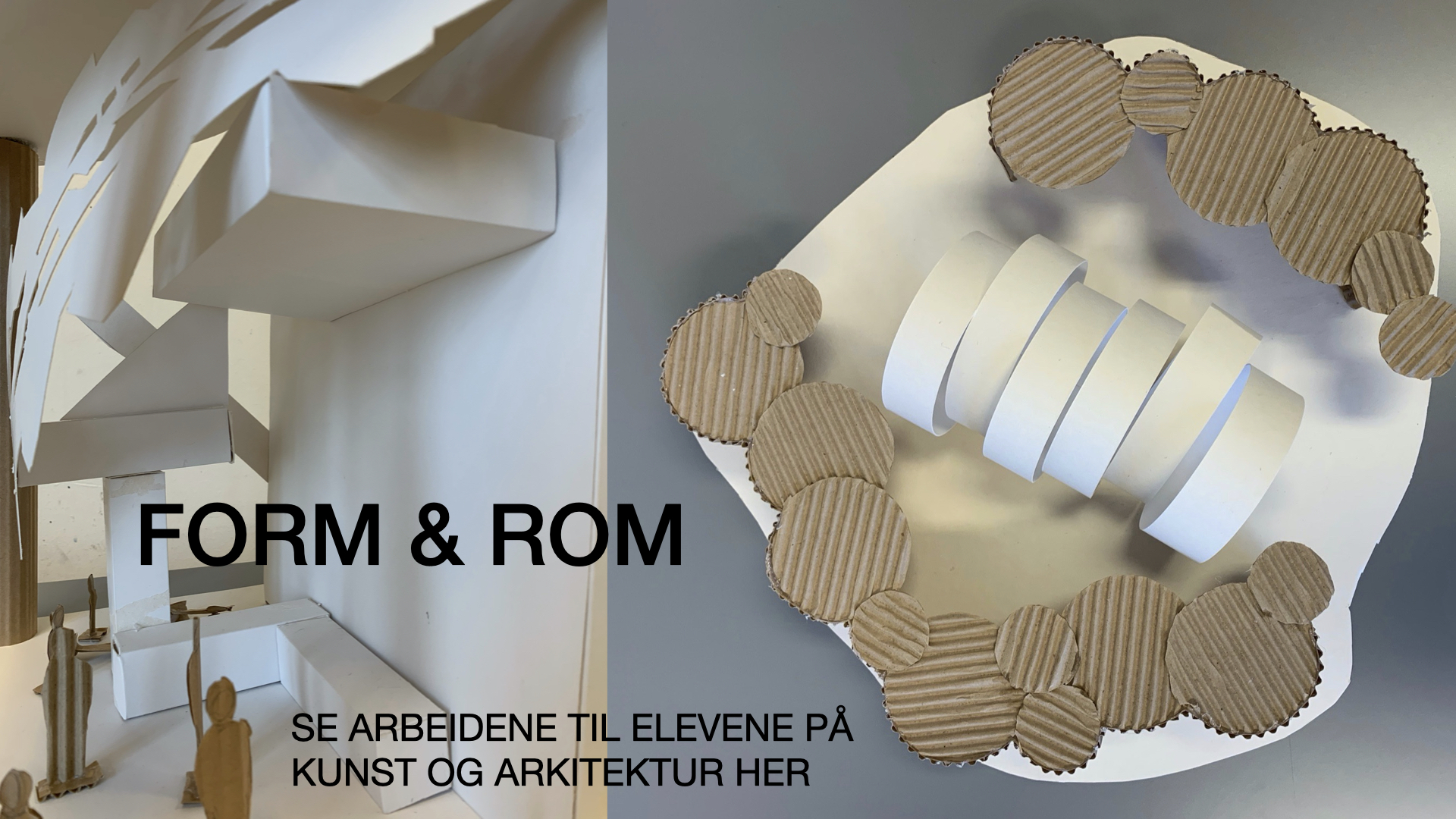 Oppgaven var først å lage en papirskulptur, og deretter å bygge modell av et museum eller et rom til skulpturen. Vi har også jobbet med arkitektens tegnemetoder med perspektiv, plan og snitt.