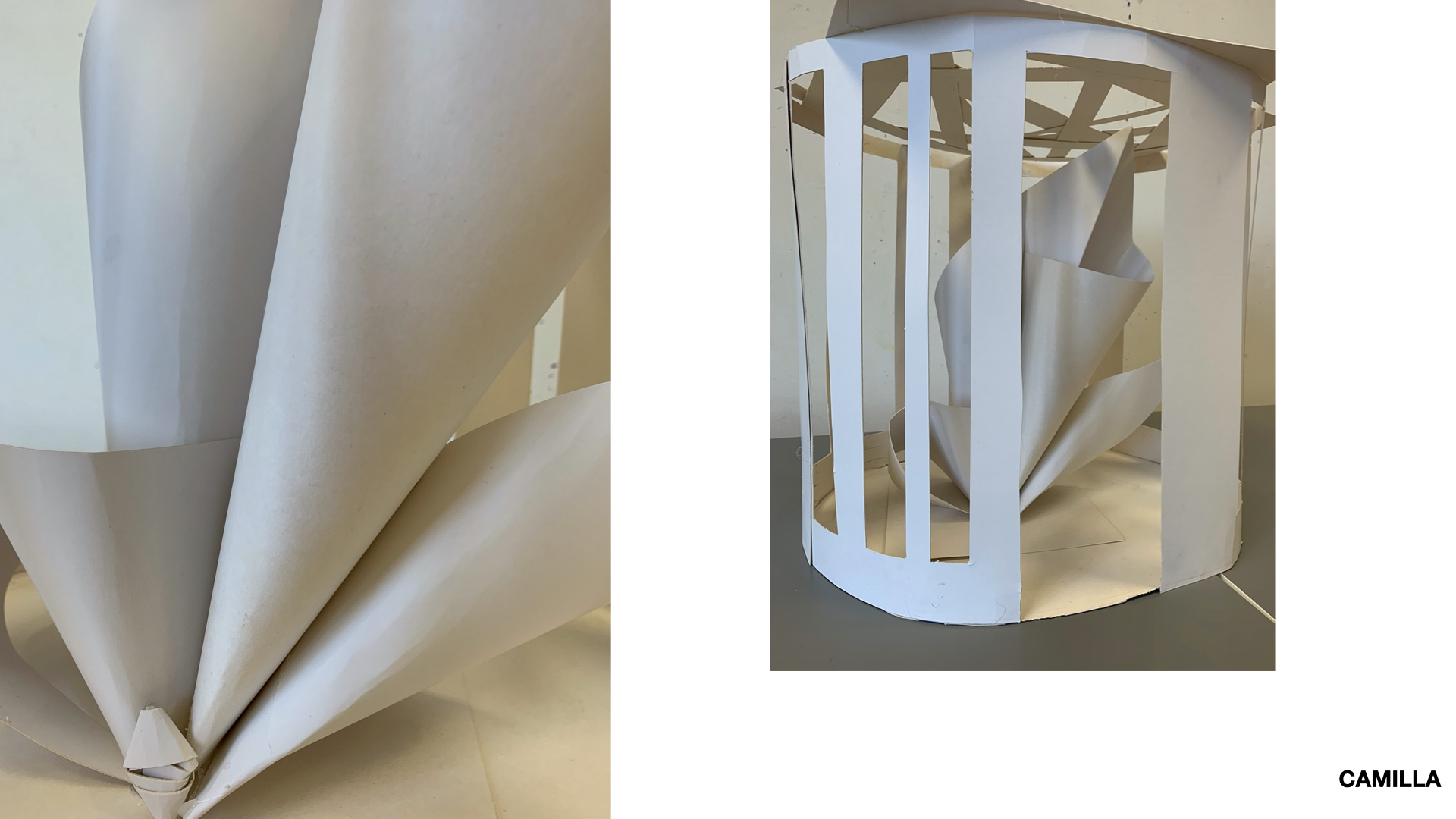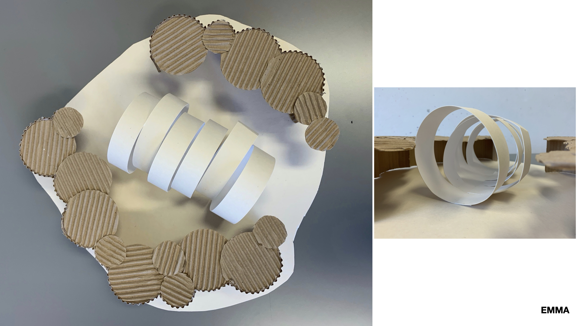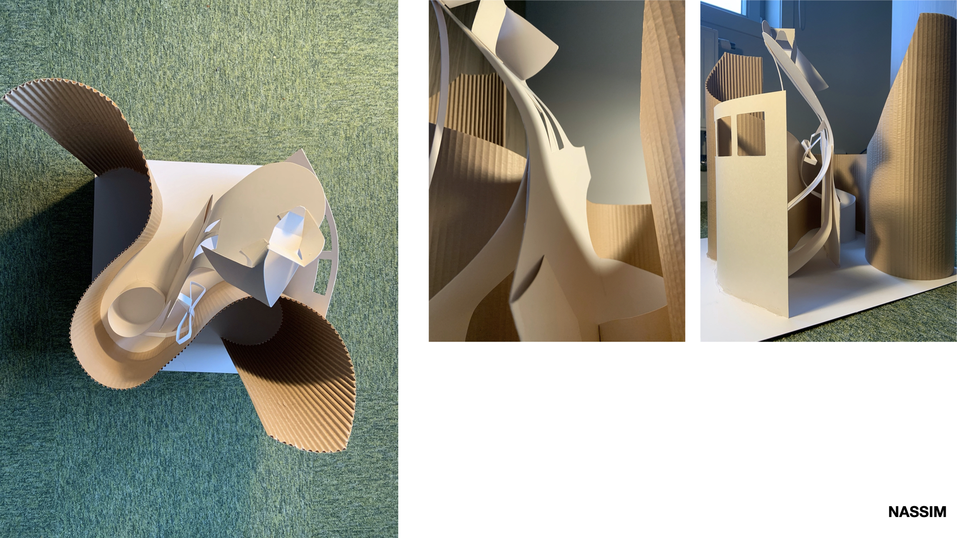 Oppgaven var først å lage en papirskulptur, og deretter å bygge modell av et museum eller et rom til skulpturen. Vi har også jobbet med arkitektens tegnemetoder med perspektiv, plan og snitt.