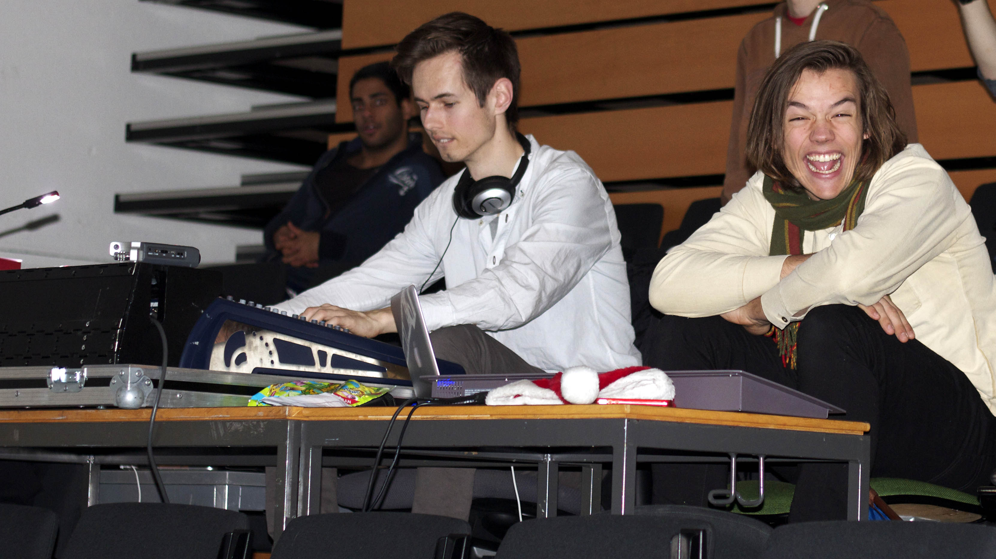Så gikk vi videre til lyd og lys ansvarlige, bedre kjent som L og L. Eirik Arnesen og Roald Renså var de eneste styremedlemmene å finne. Vi fikk vite at Roald styrte lyset, mens Eirik styrte lyden. Eirik har også promotert hele juleforestillingen sammen med John Huse Olsen.