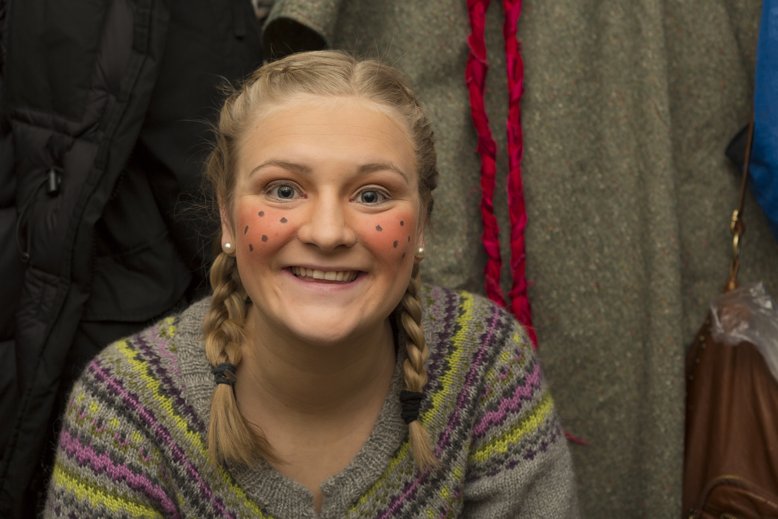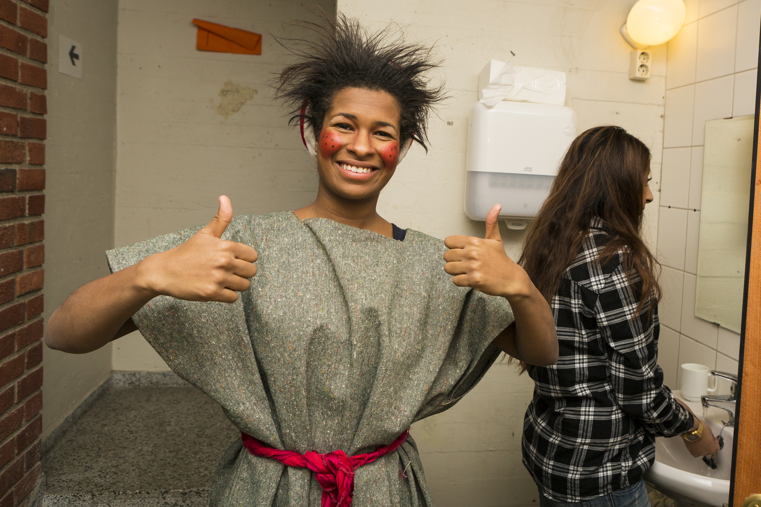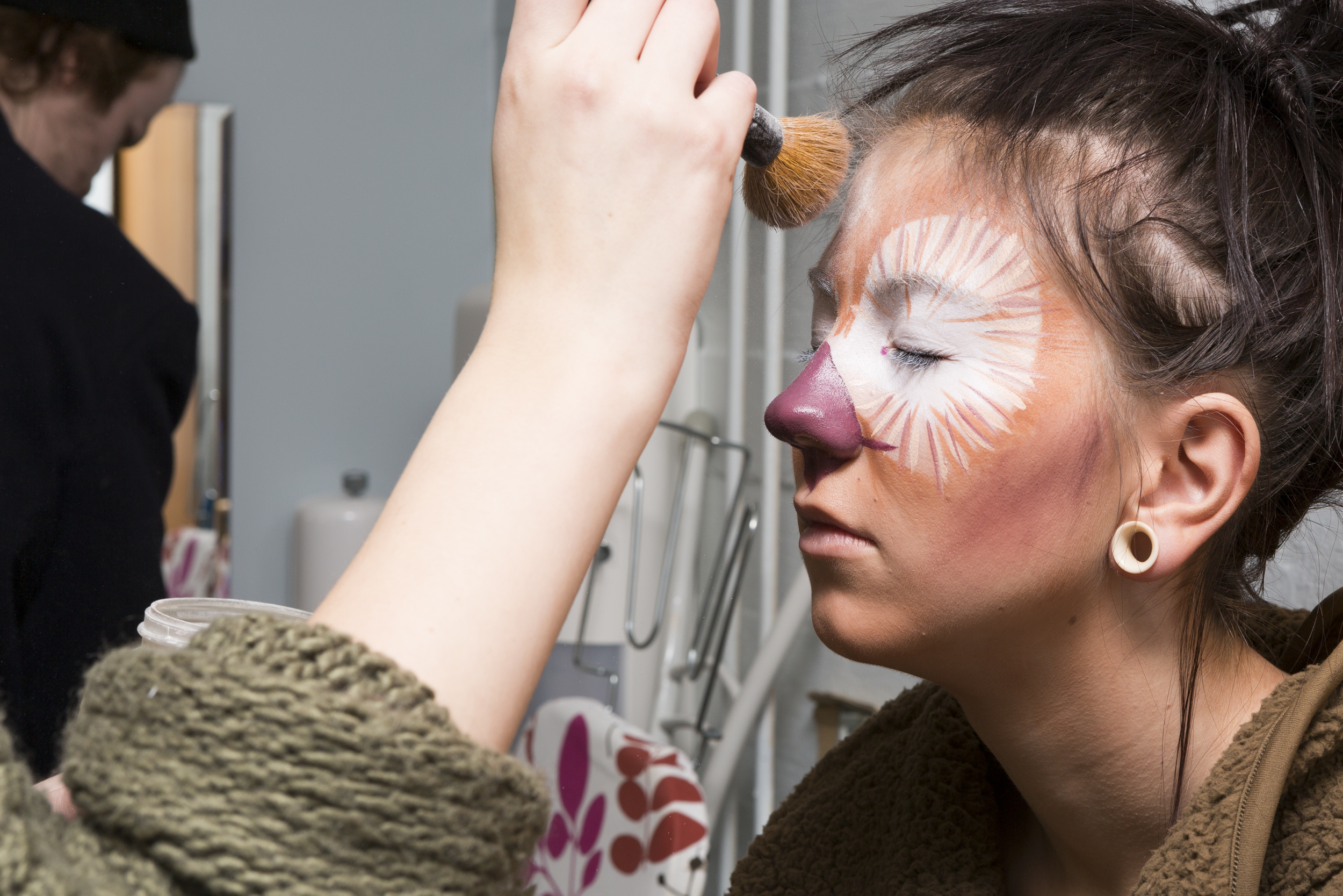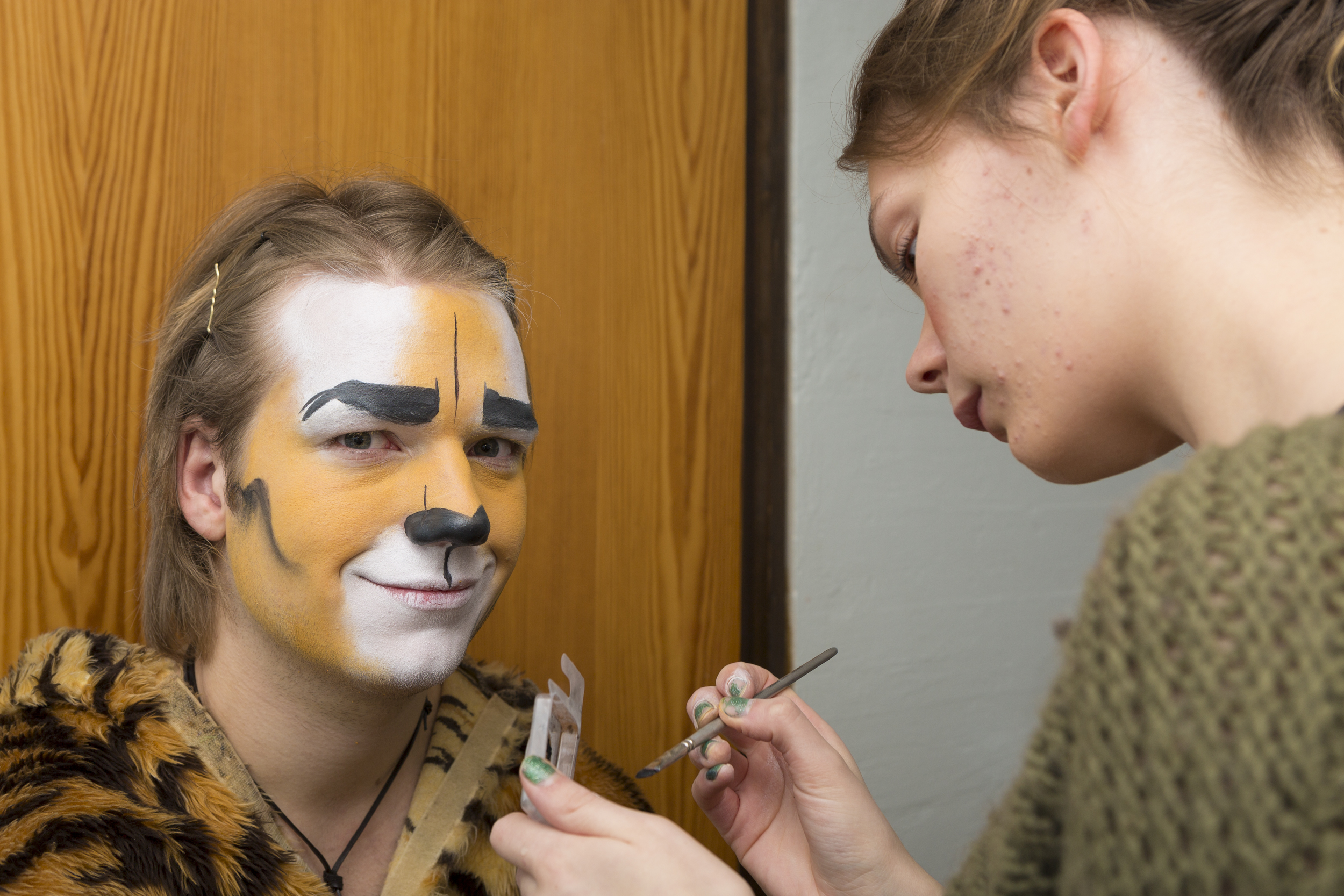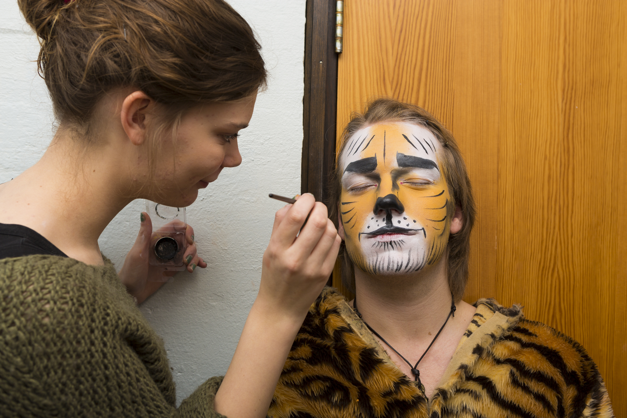 - Når noe på scenen blir ødelagt på og vi har mulighet for å fikse det, så fikser vi det. Som f. eks på mandag ble halen til tigeren dratt av kostymet av et lite barn, og da måtte vi sy den på igjen. Ellers er jobben vår å sminke skuespillerne.