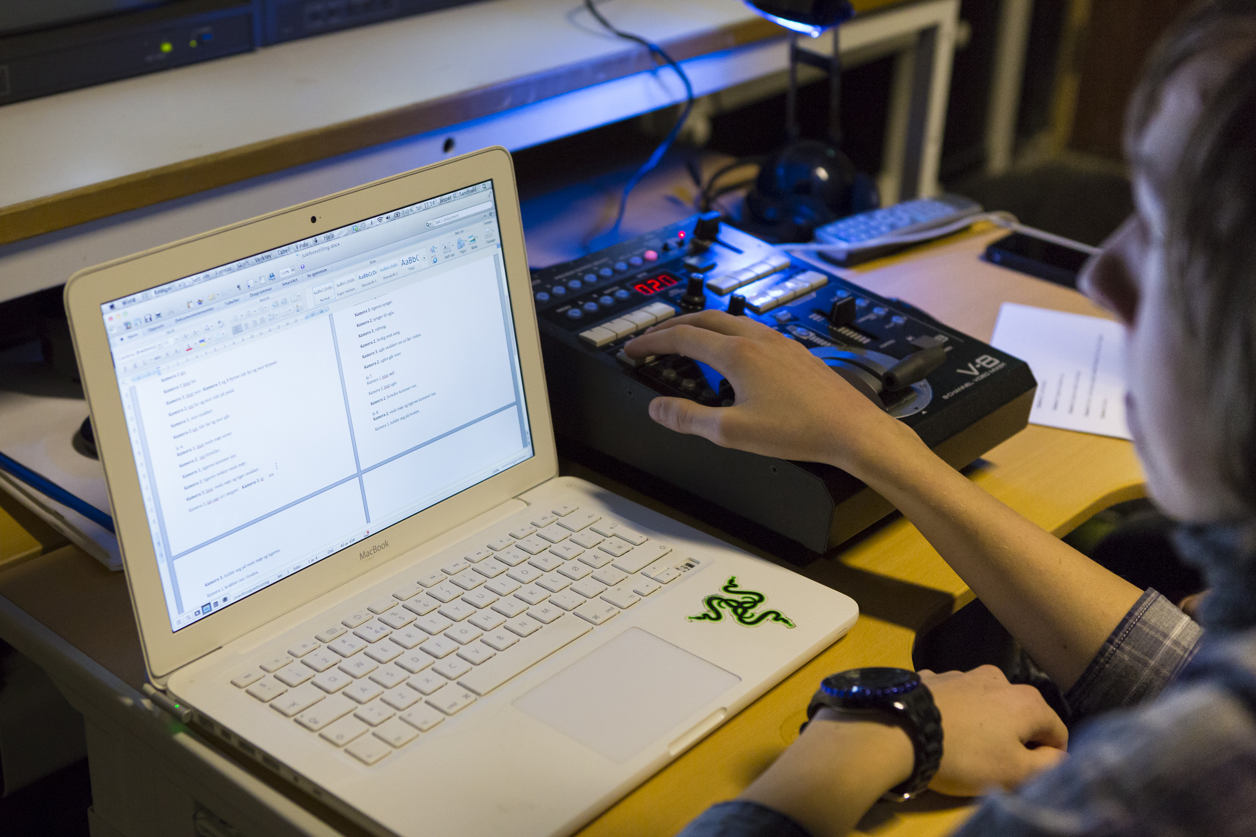 Resten av dagen handla rett og slett om filmegruppa, ettersom det er deres siste dag med filming av juleforestillingene. Vi intervjua Thomas Riseng, Christoffer Dynna Johannessen og Jesper Slettmoen Sandvold. I går den fjerde desember testet de ut det de kaller for ‘’fler kamera produksjon’’. Ettersom det gikk greit ville de kjøre det på forestillingen i dag også.
