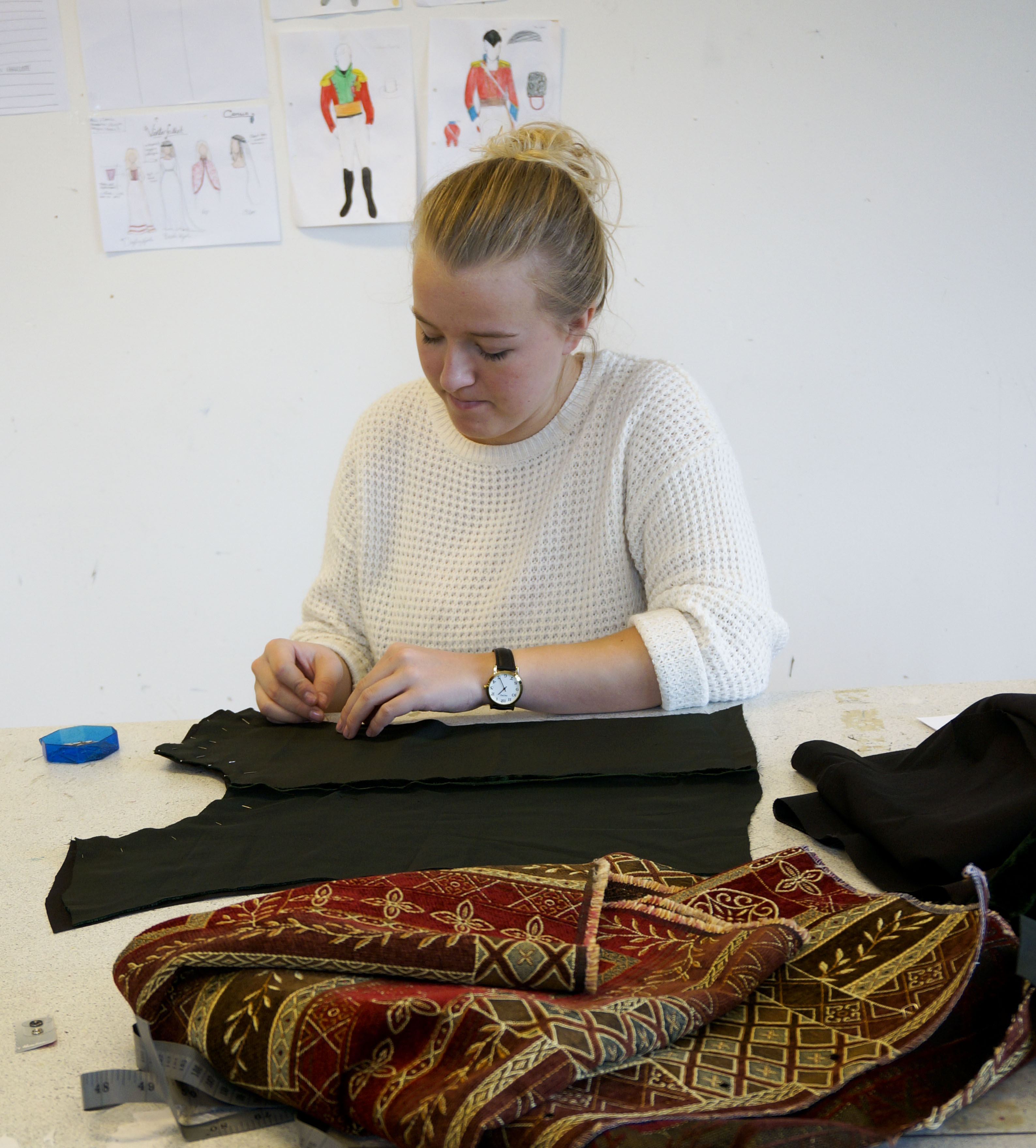- Først må man finne stoff og tegne mønster. Deretter legger man mønsteret på stoffet og klipper. Til sist syr man det sammen, men innimellom disse trinnene er det uendelig mange prøvinger med skuespillere, forteller Kristin.