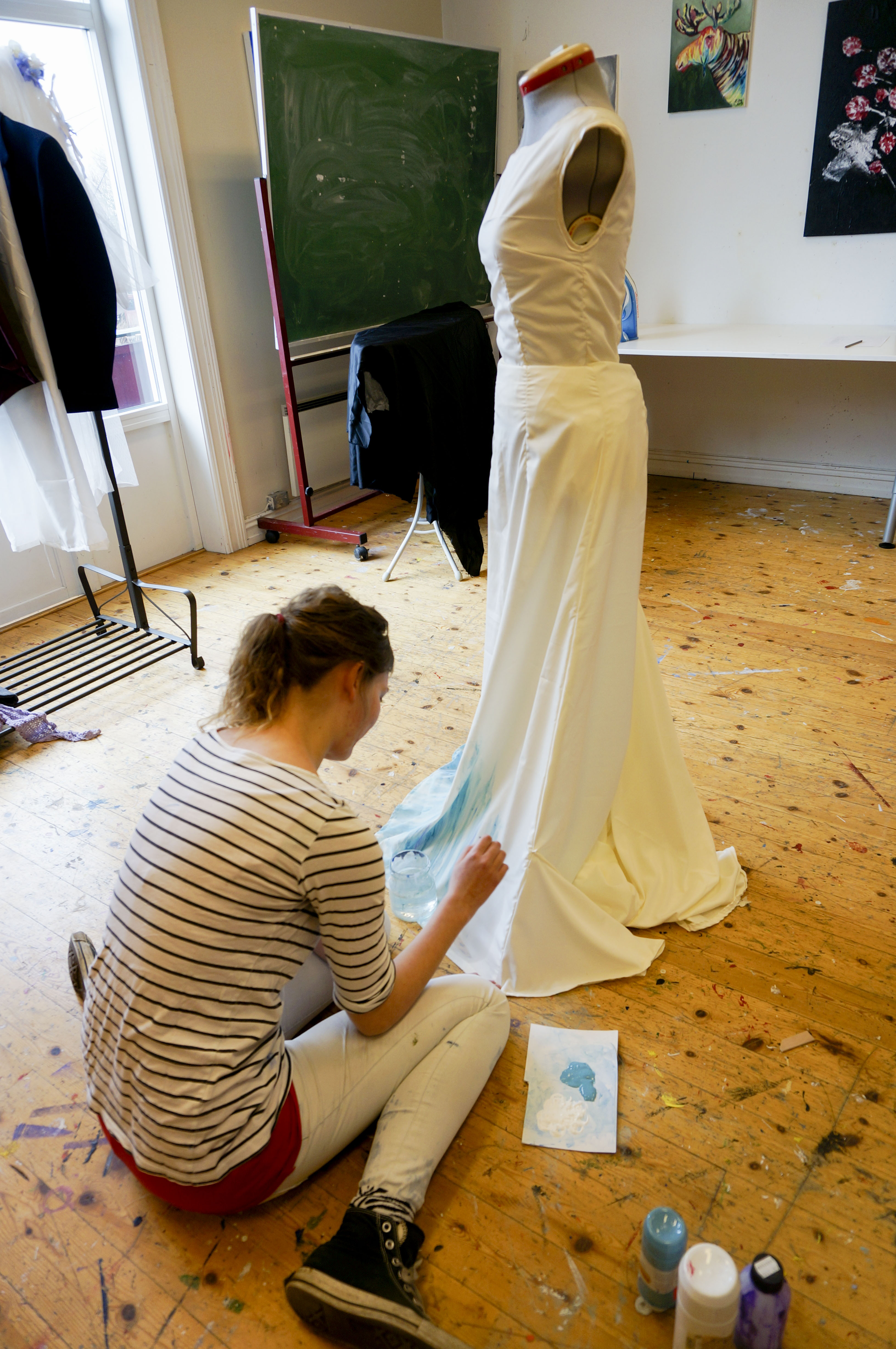I et annet hjørne finner vi noen som jobber med kostymene til skuespillerne. Kristin Omsveen og Anna Cecilie Tromop arbeider med kostymene til Camilla og Vinterdronningen. De forteller at de fleste ikke har drevet stort med kostymedesign før, likevel får de muligheten til å lage kostymer helt fra bånn av.