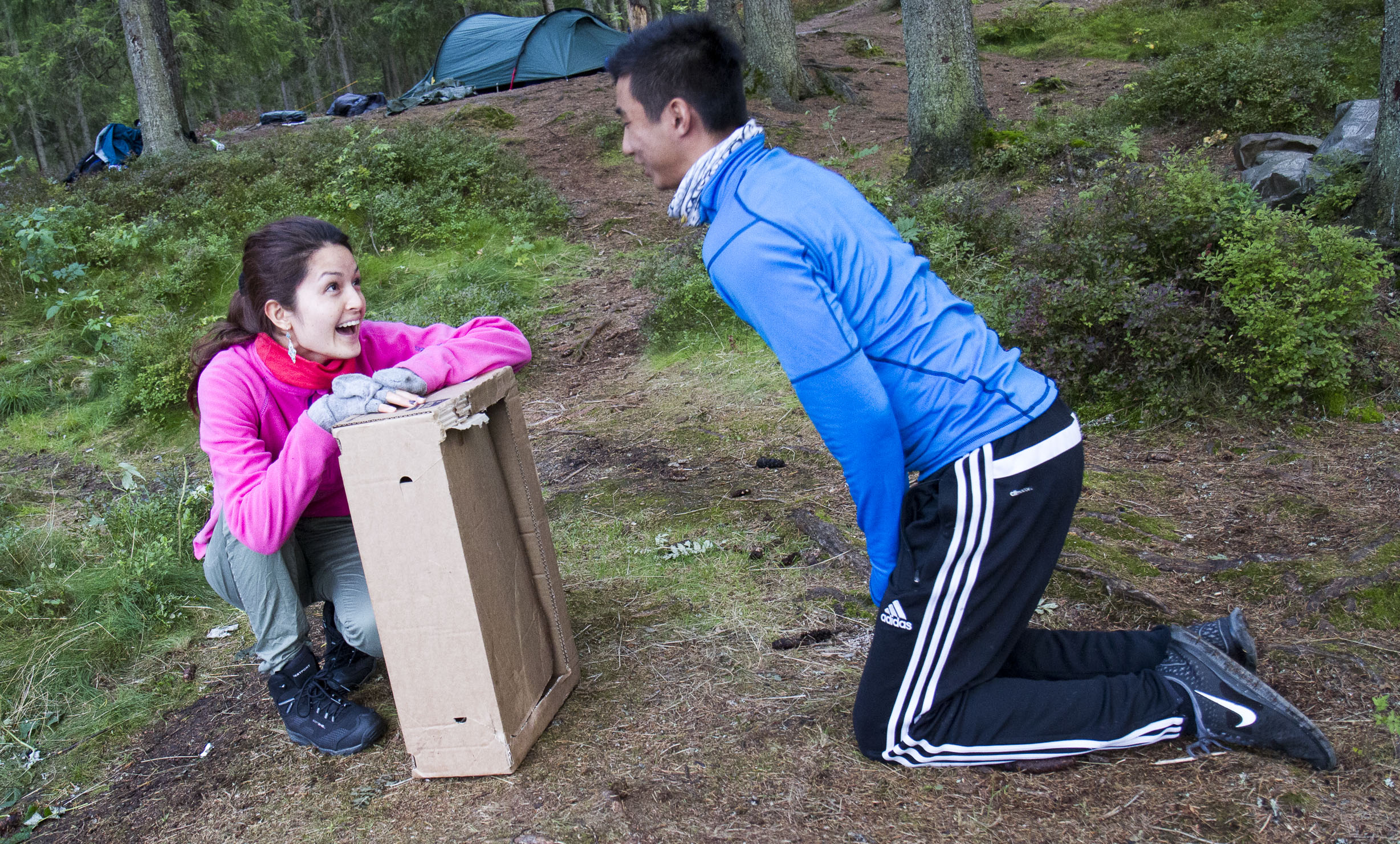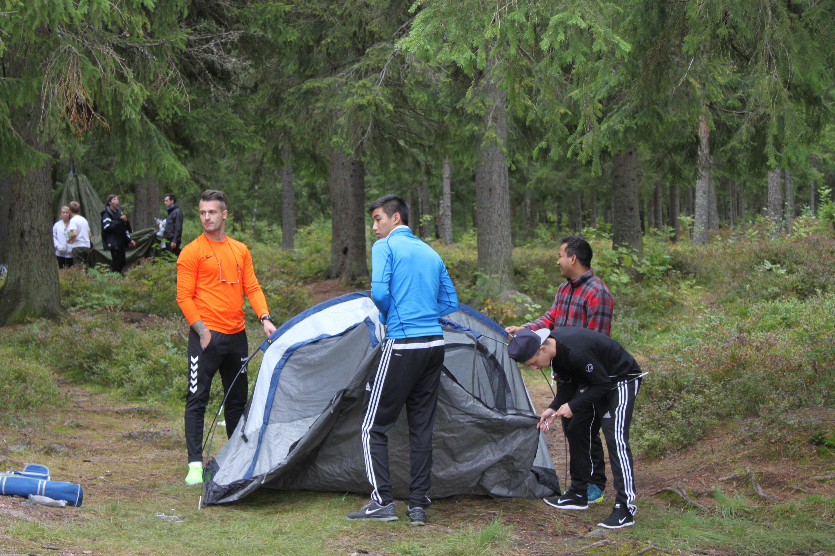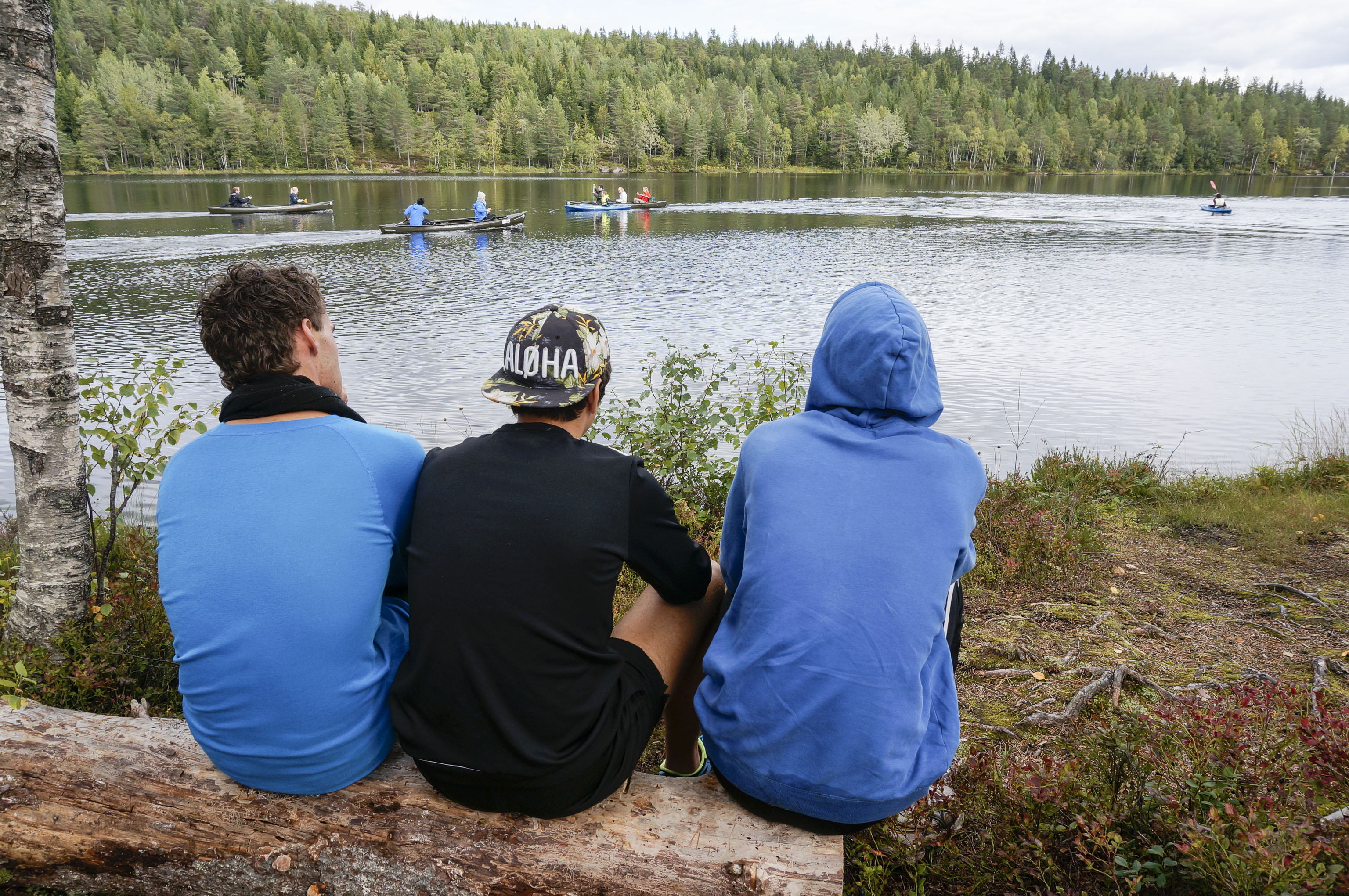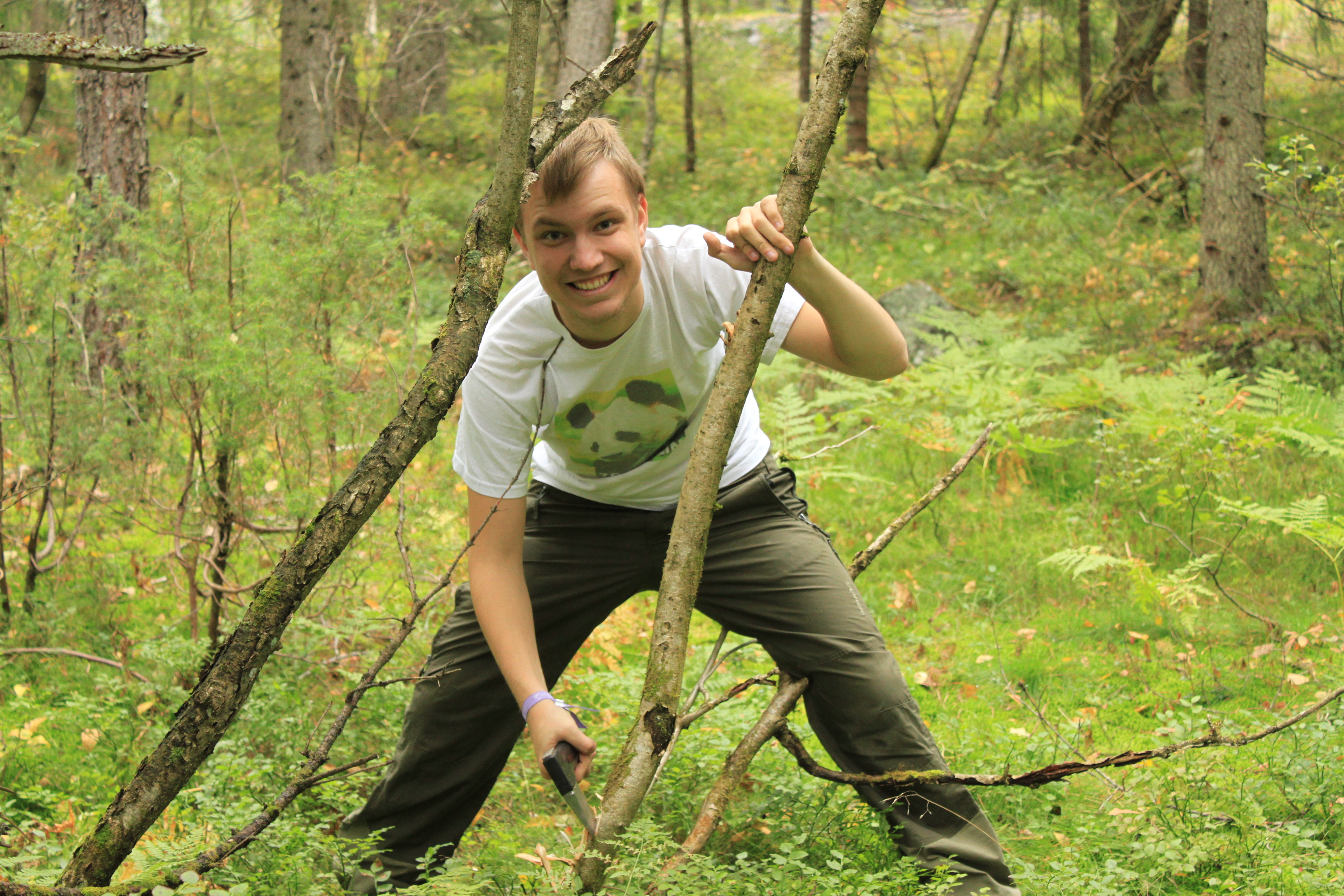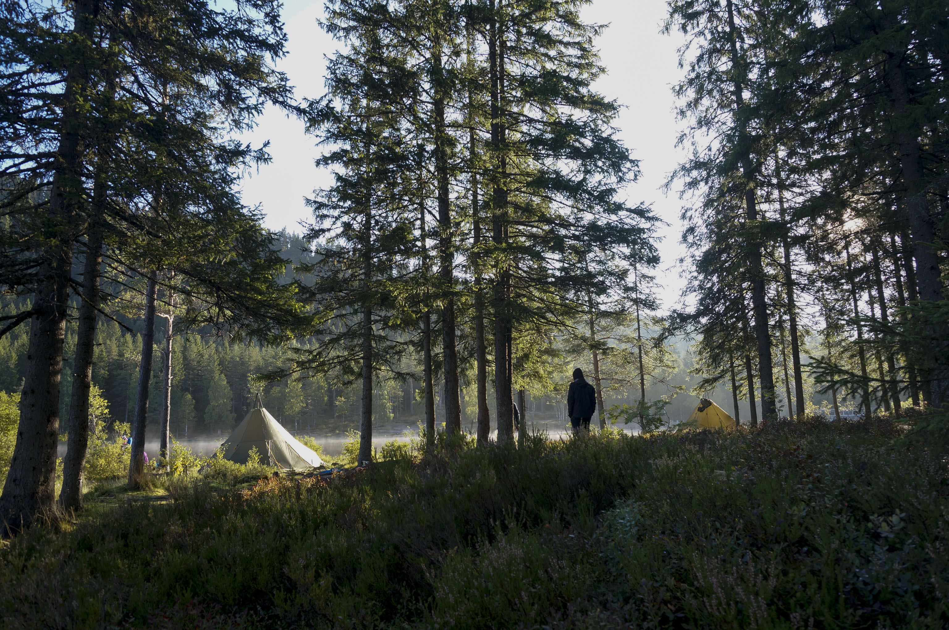 Vi slår leir mitt i skogen blandt maur og mygg. Ved må vi hogge selv, og kaffe koker vi på bålet. Fisken må også fiskes.