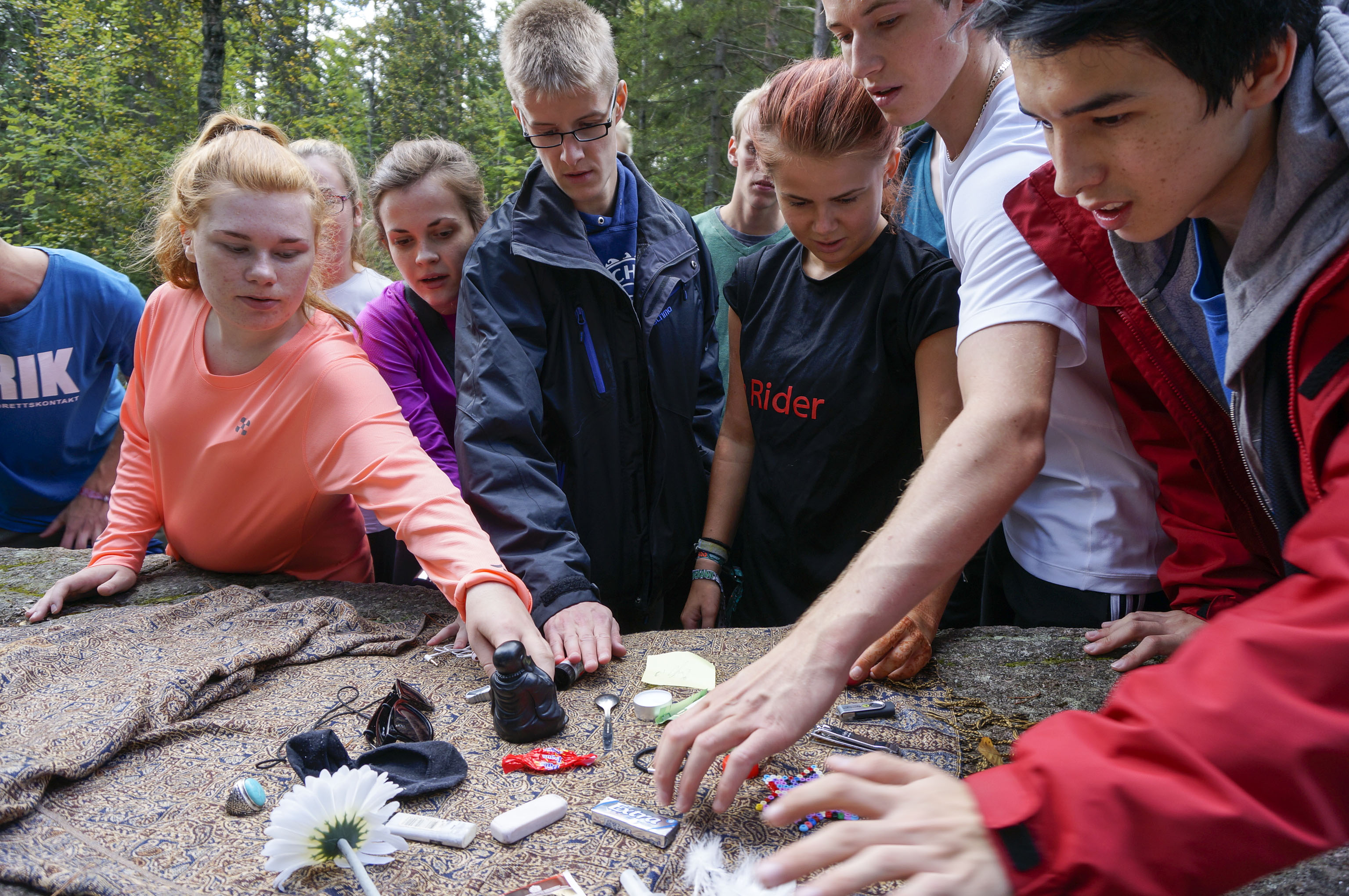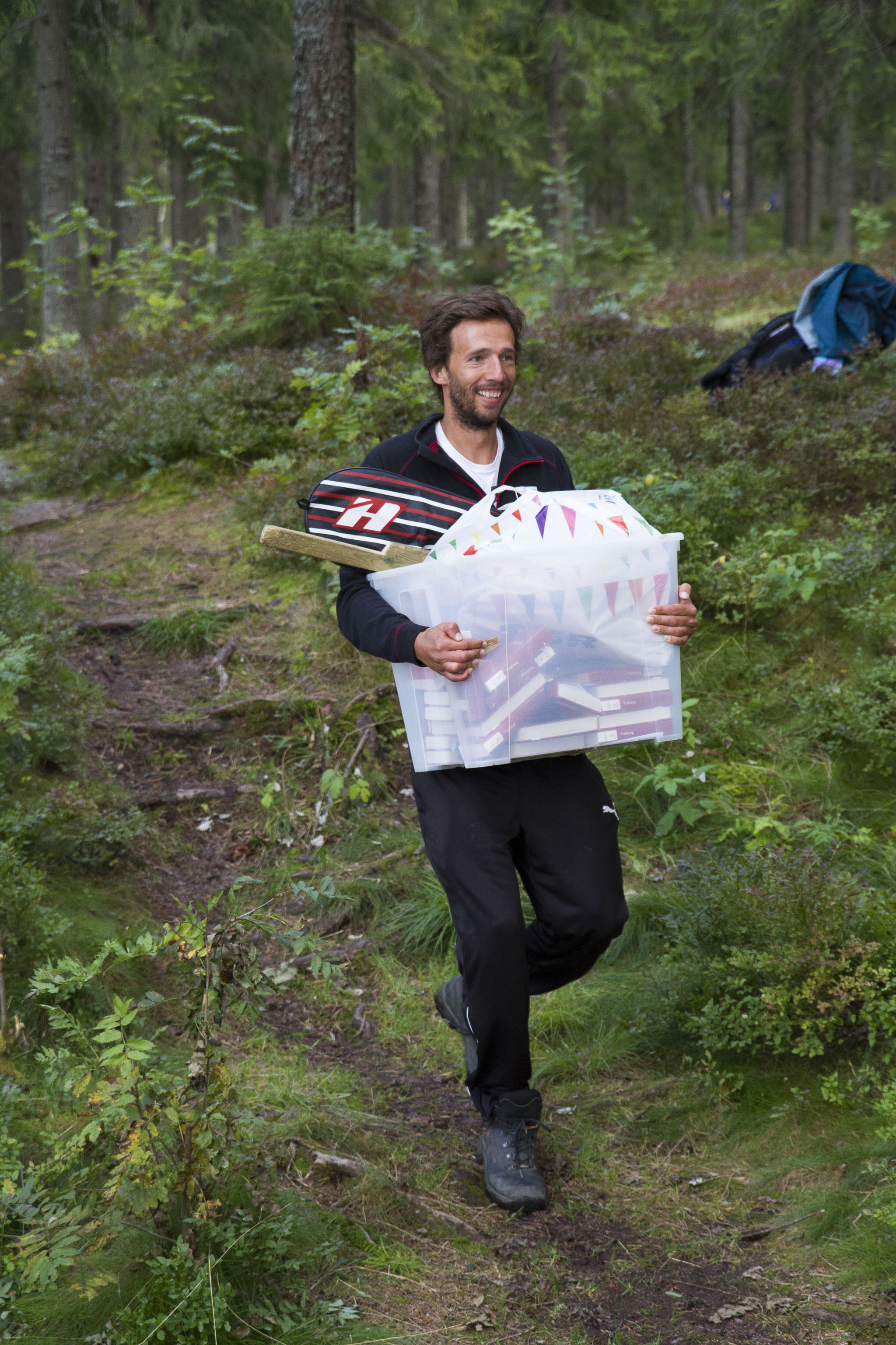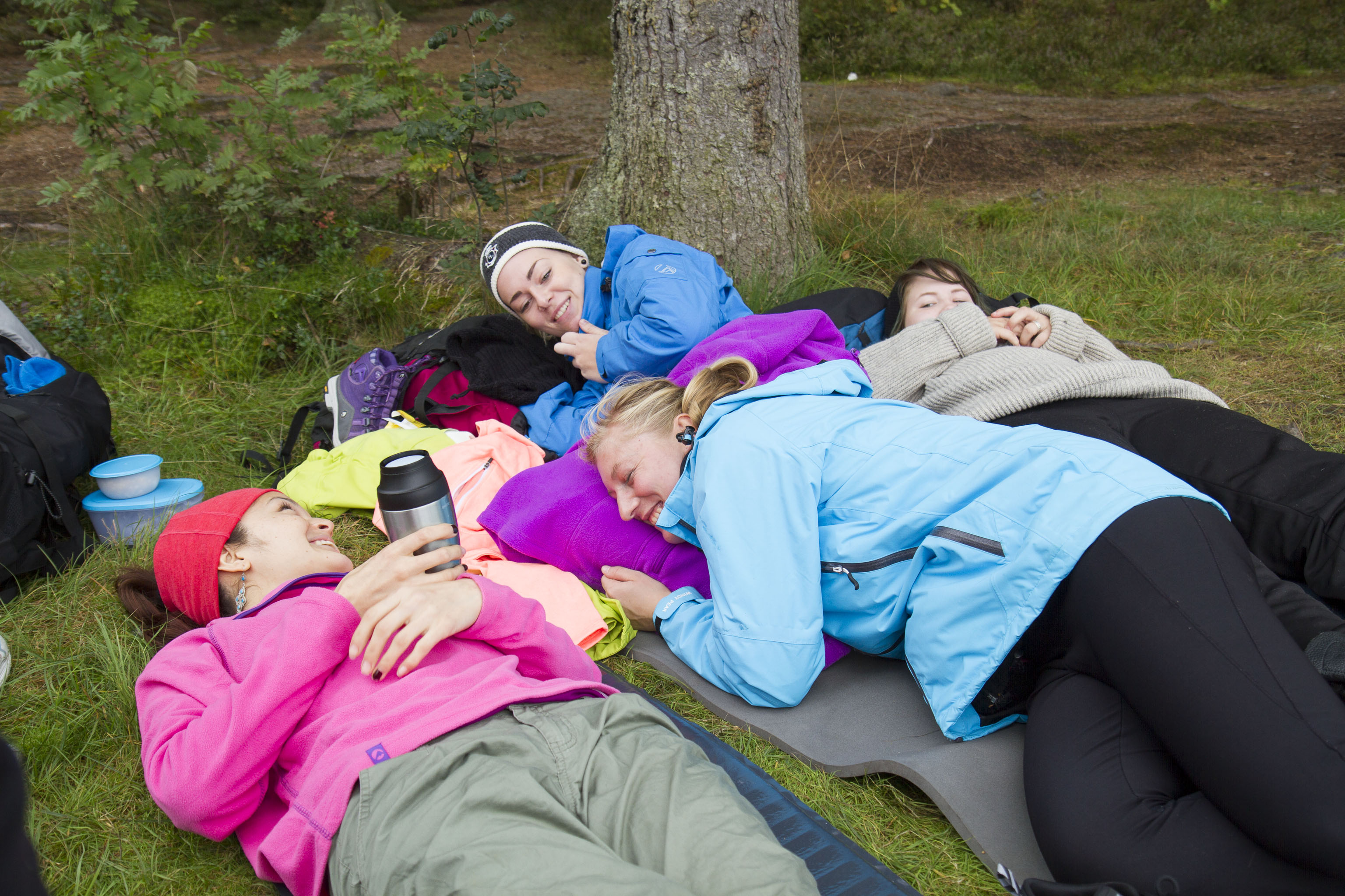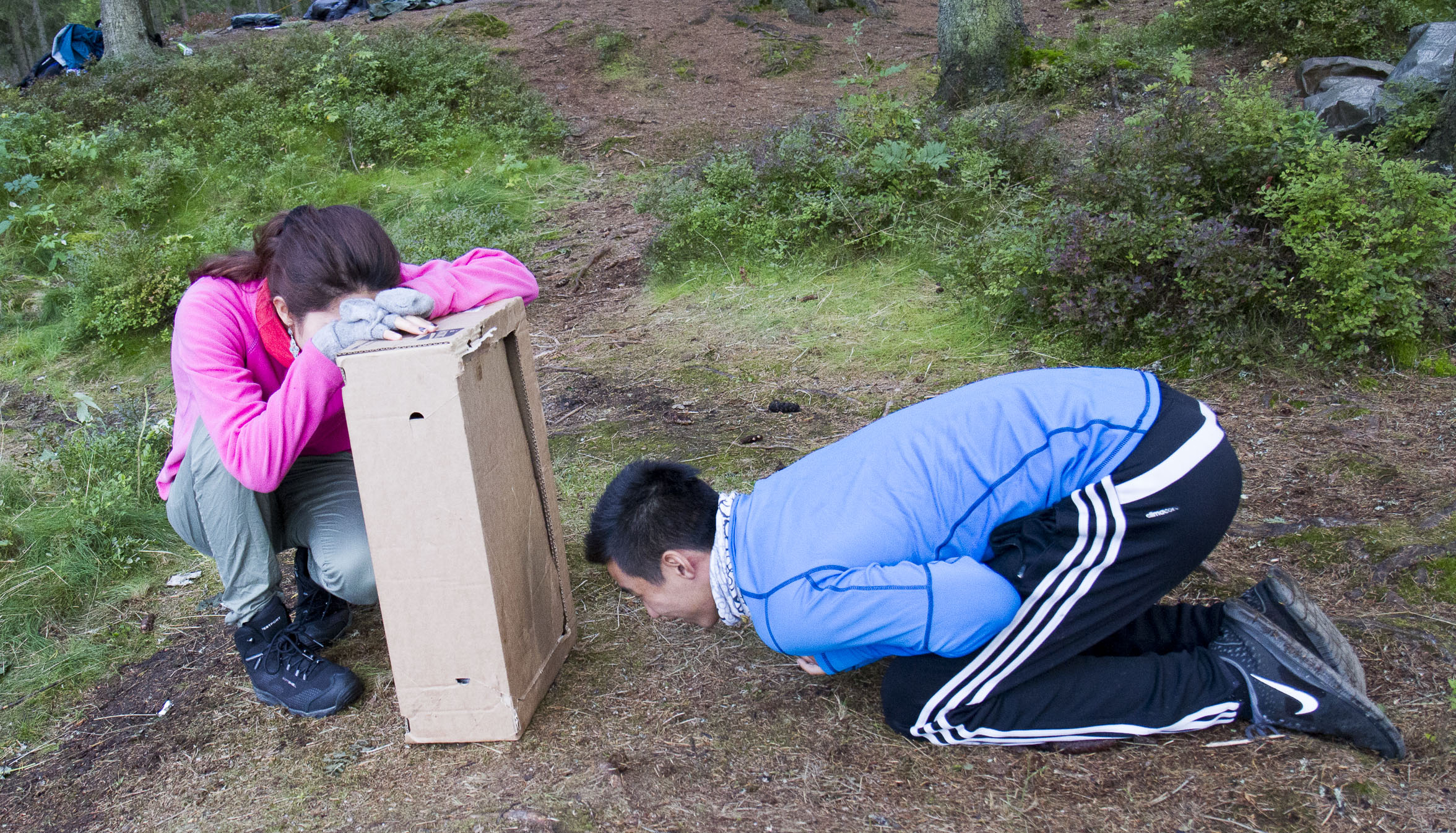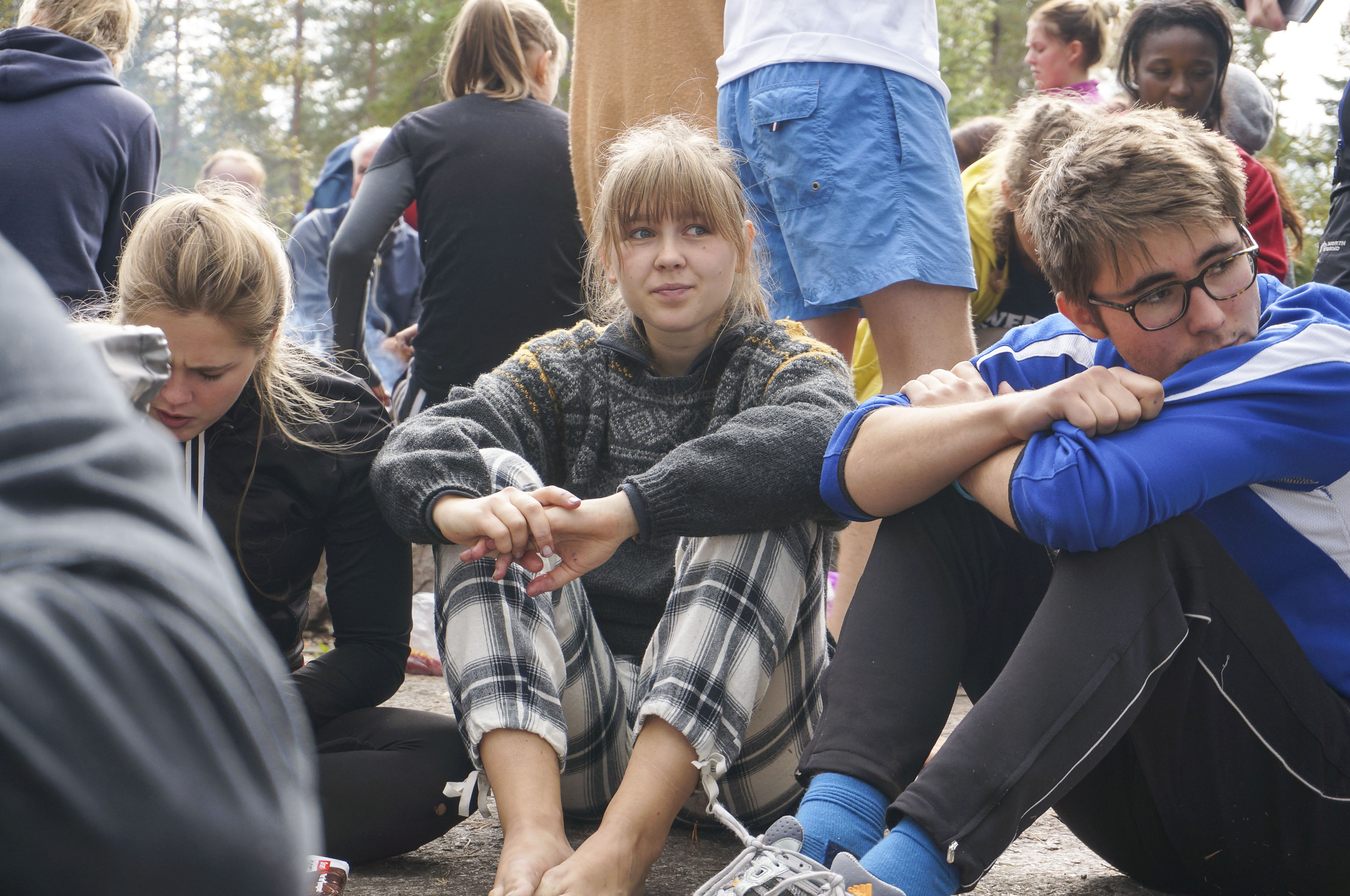 Vi slår leir mitt i skogen blandt maur og mygg. Ved må vi hogge selv, og kaffe koker vi på bålet. Fisken må også fiskes.