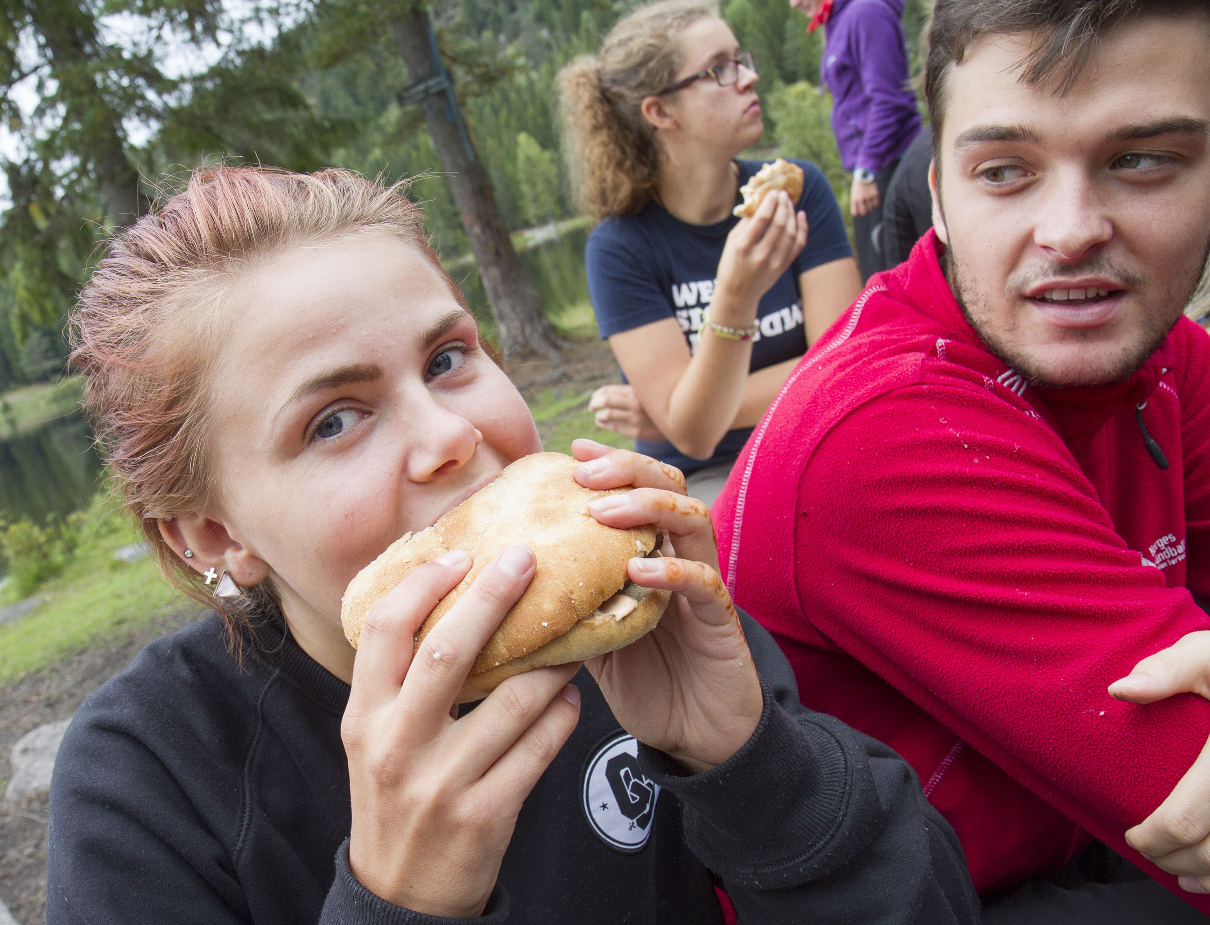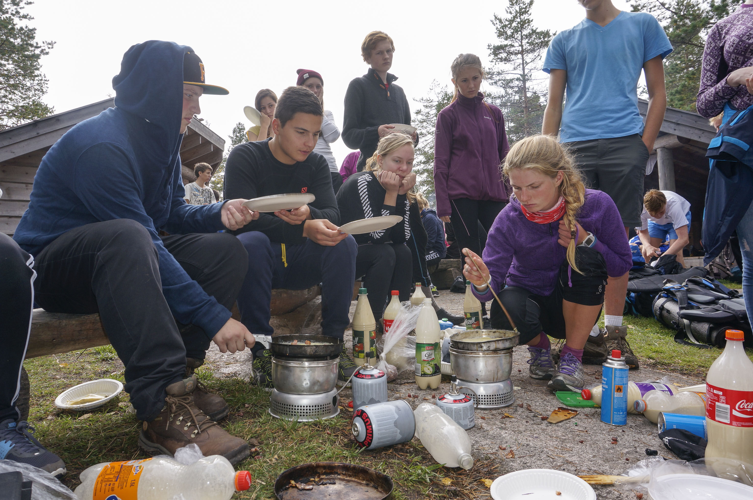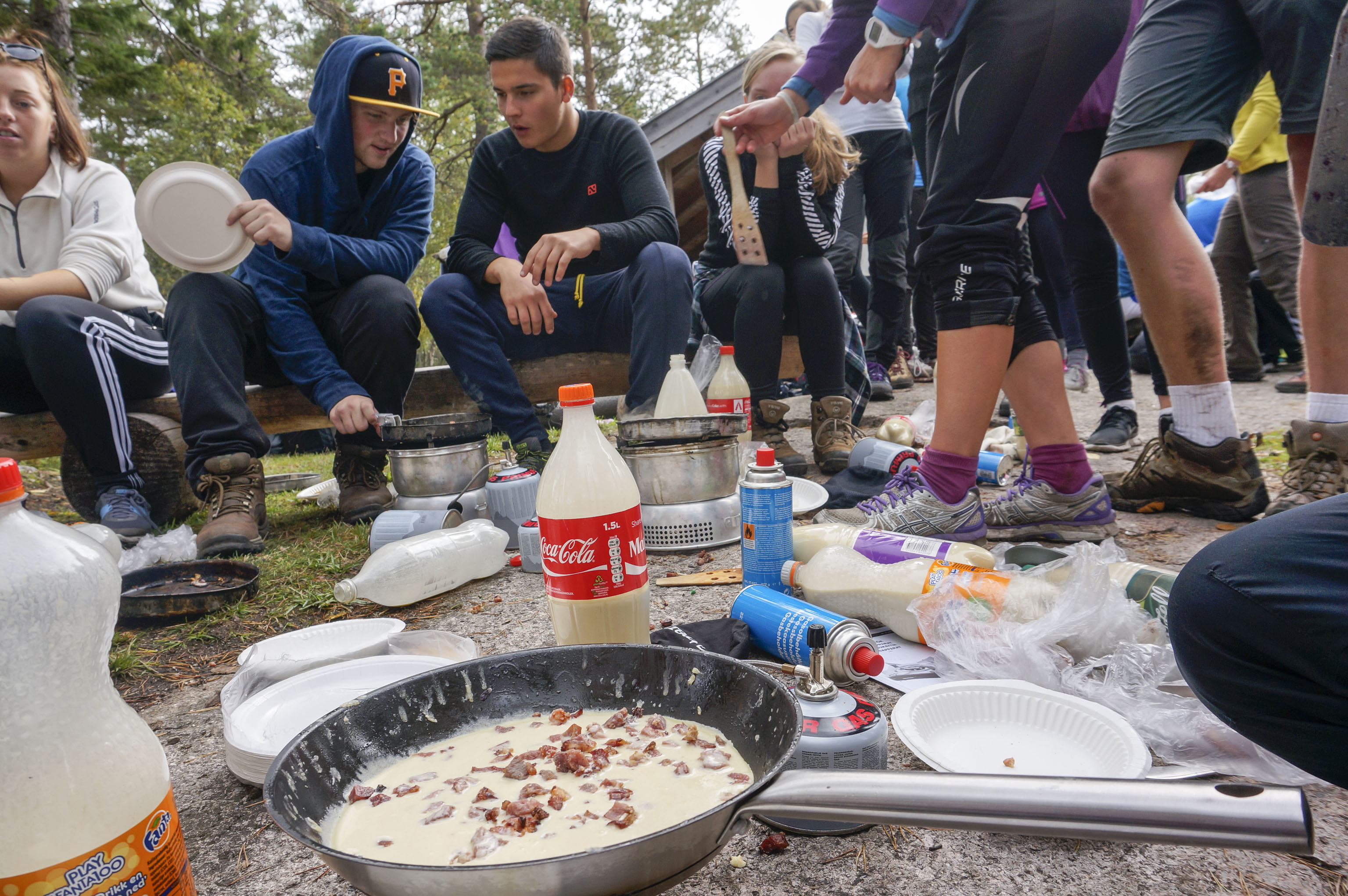 Pannekaker med bacon og blåbær smaker ekstra godt nå. Elevene har båret pannekakerøra med seg på plastflasker. Pannekakene lager de selv på stormkjøkken. Noen har fått gnagsår og vonde knær, men fortsetter med godt mot.
