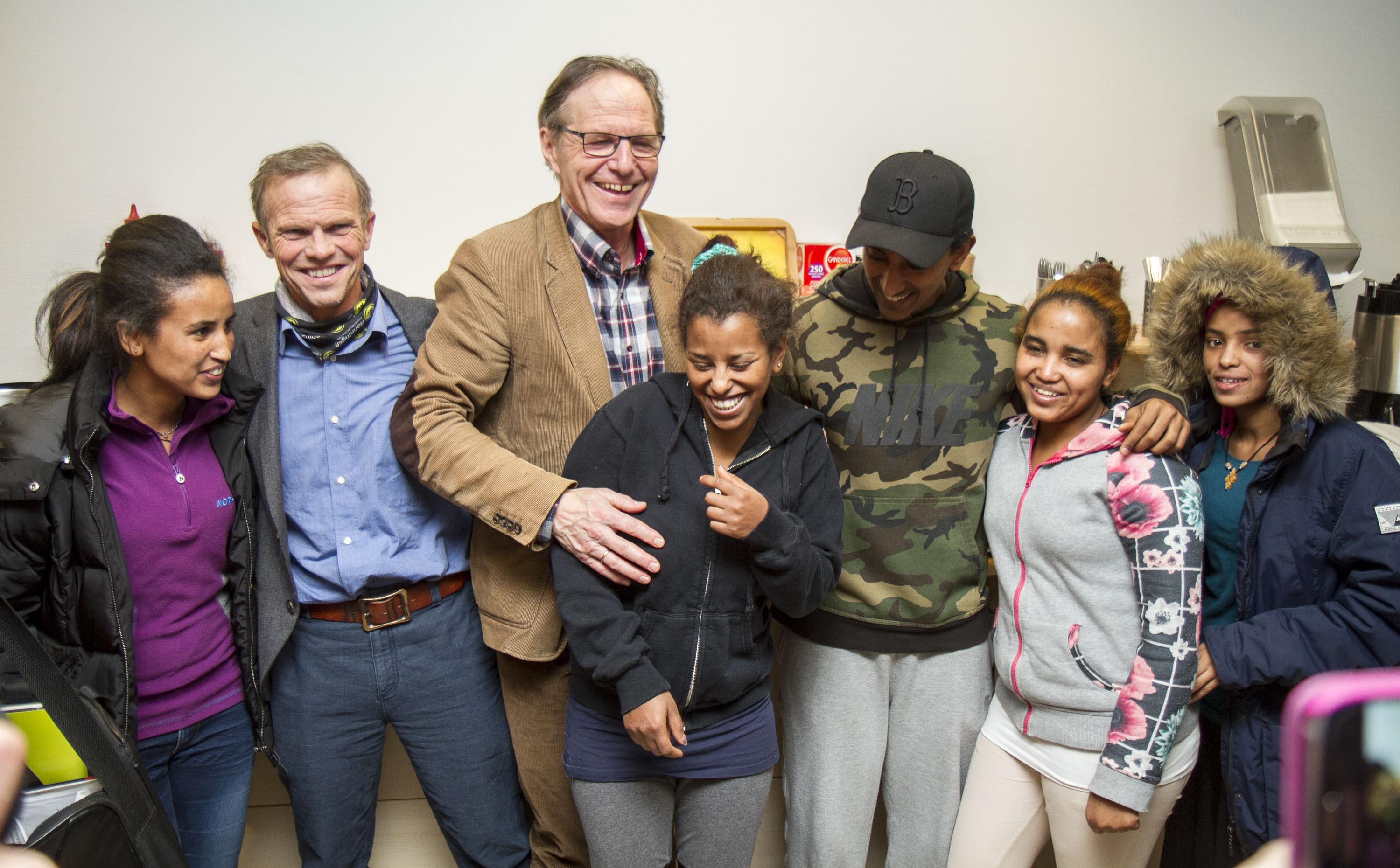 Glade jenter sammen med rektor Svein, Tor Grønmyr fra NKF og Nate