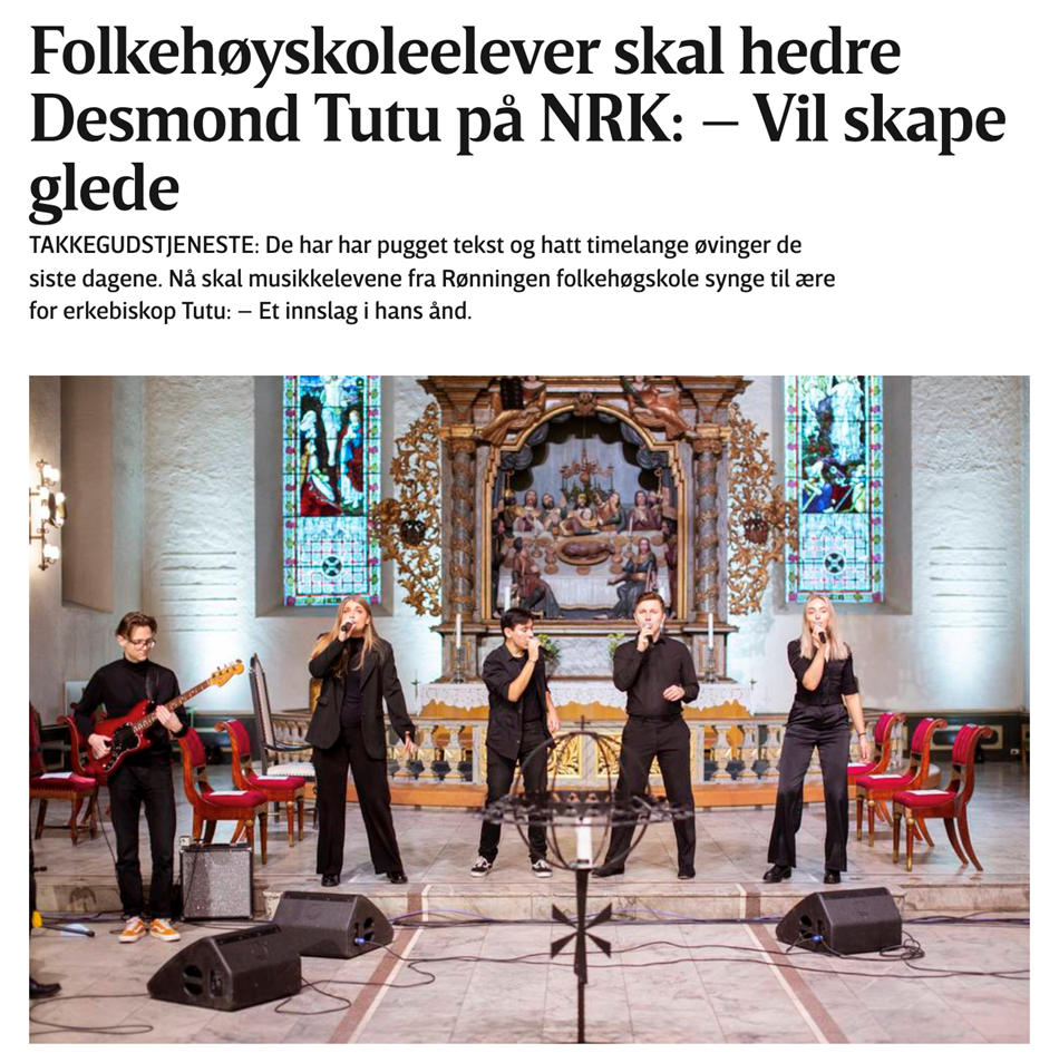 Rønningen Folkehøgskole har deltatt ved flere møter med Tutu siden folkefesten i forbindelse med fredsprisen i 1984, og det var en ære å bli spurt om å delta ved takkegudstjejesten, der kun 50 personer kunne være til stede grunnet restriksjonene som gjelder for tiden.