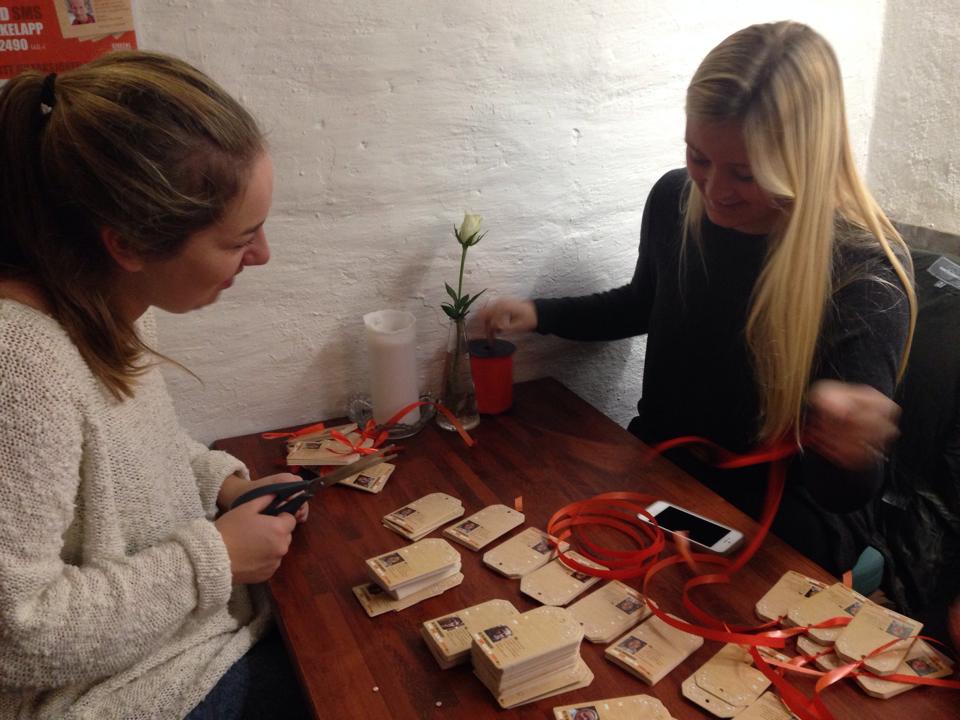 Elevene på SE:Oslo har i forkant av aksjonen merket skjerfene med merkelapper og pakket gavelapper. Ved å kjøpe disse «til og fra» lappene gir du to middager til en som gruer seg til jul.