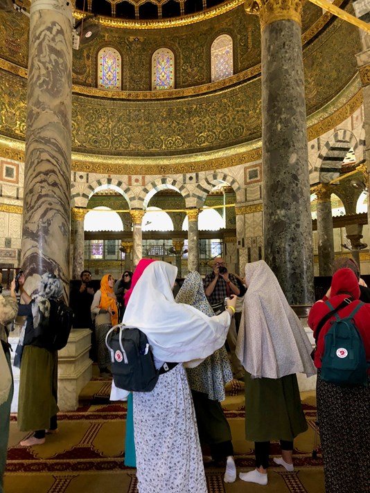 SE:Verden fikk i år for første gang komme inn i både Klippemoskeen Dome of the Rock og Al Aqsa på Haram al Sharif i Jerusalem. Dette er det tredje helligste stedet for muslimer etter Mekka og Medina. Turister kommer kun inn på området via israelsk-kontrollerte checkpoints, men denne gangen fikk vi komme inn som gjester hos Awqaf - the Islamic religious authorities - og kunne entre området fra Lions Gate. For å komme inn i moskeene måtte jentene dekke seg til etter gjeldende regler.