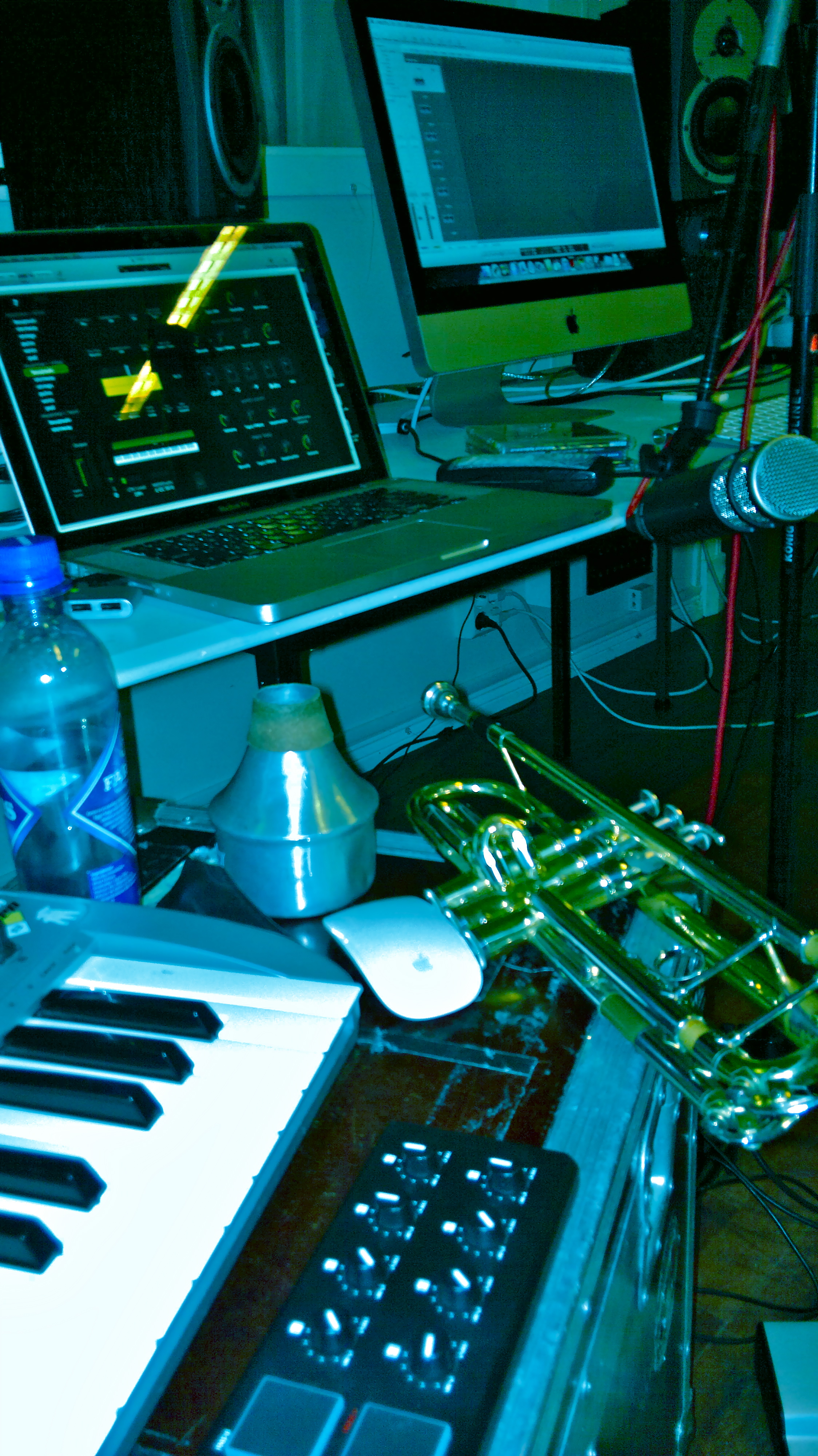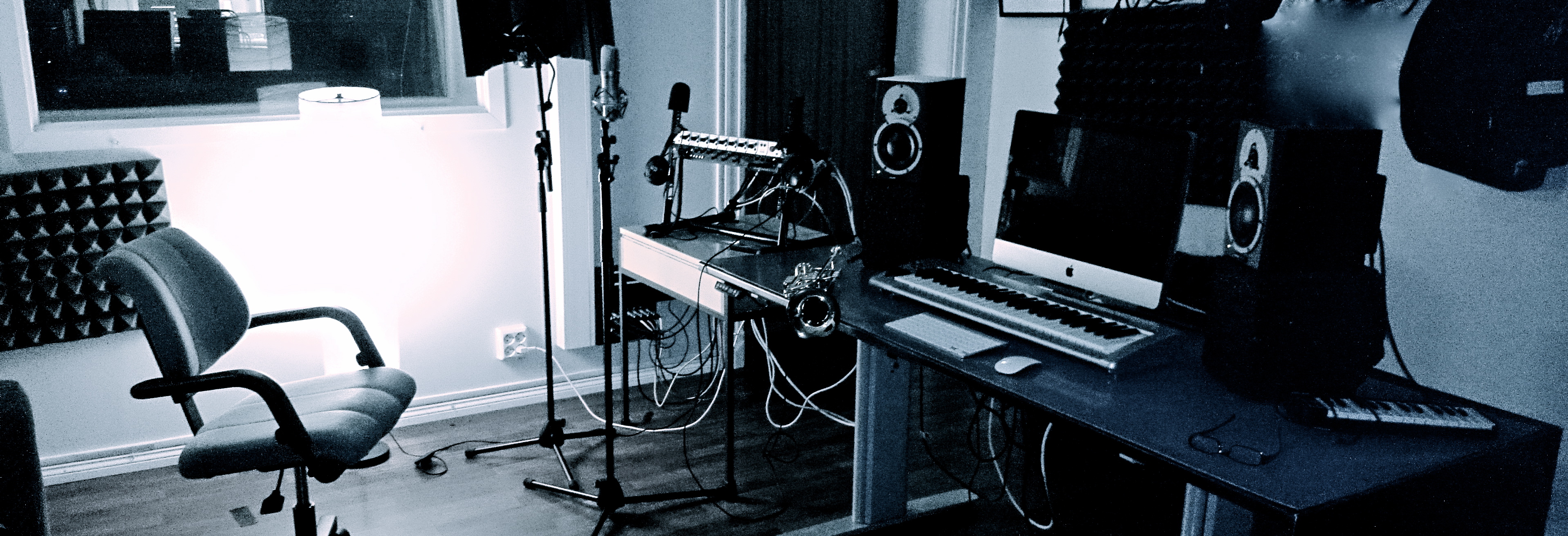 Her kan vi også tappe linjer som kommer inn fra to andre studioer og fra konsertsalen i etasjen over. Stabil mac m. Logic , gode lydkort og mikker, strålende lytting med Dynaudio monitorer og Beyerdynamic 770 Pro headset.